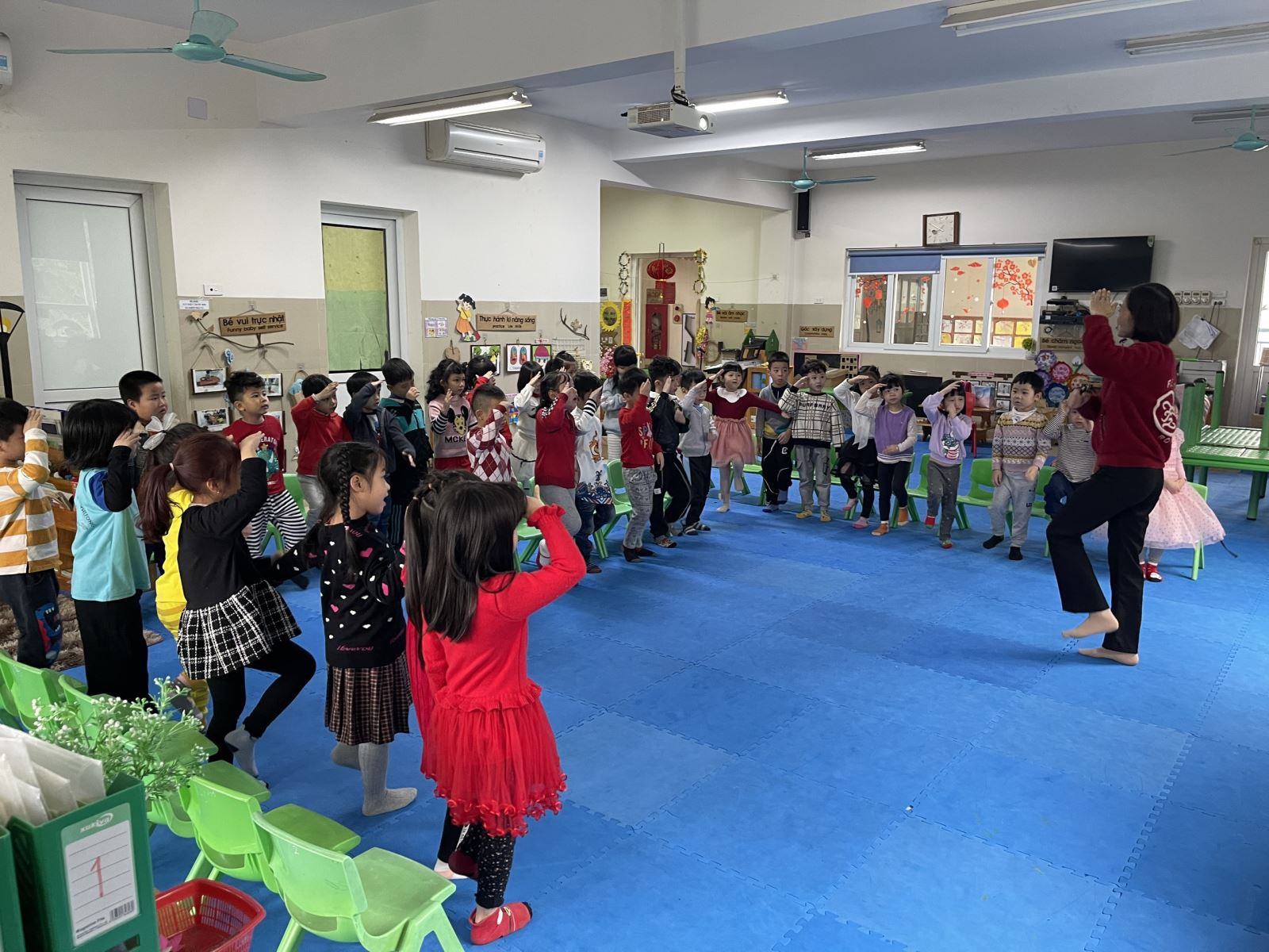 Các bé đang hát cùng cô bài "Cháu yêu chú bộ đội"