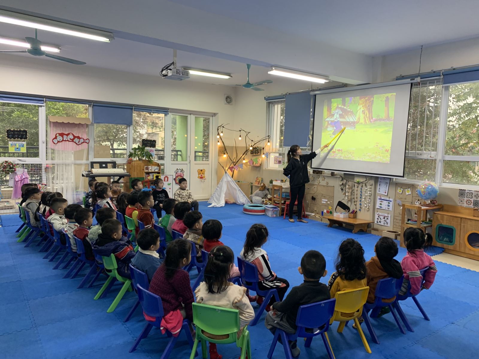 Các bạn nhỏ đang chăm chú lắng nghe cô kể chuyện.