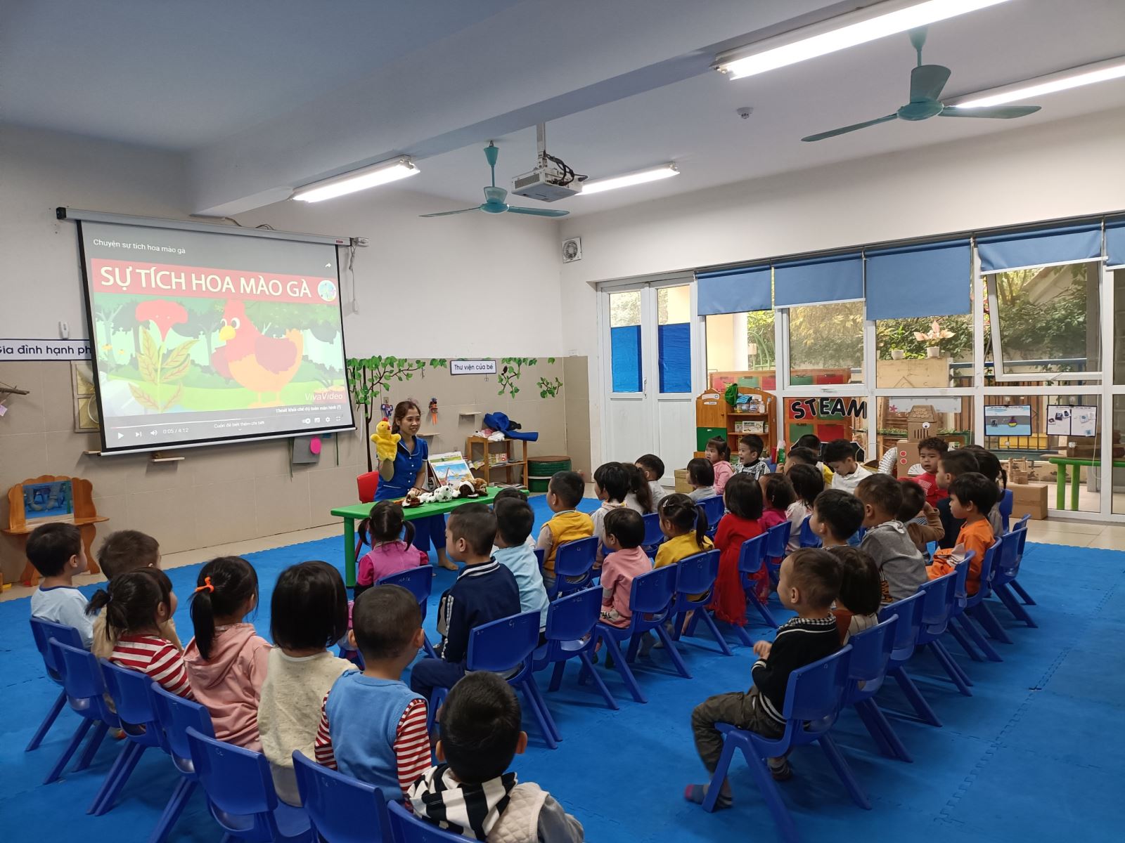Trẻ nghe cô kể chuyện kết hợp với rối minh họa nội dung truyện