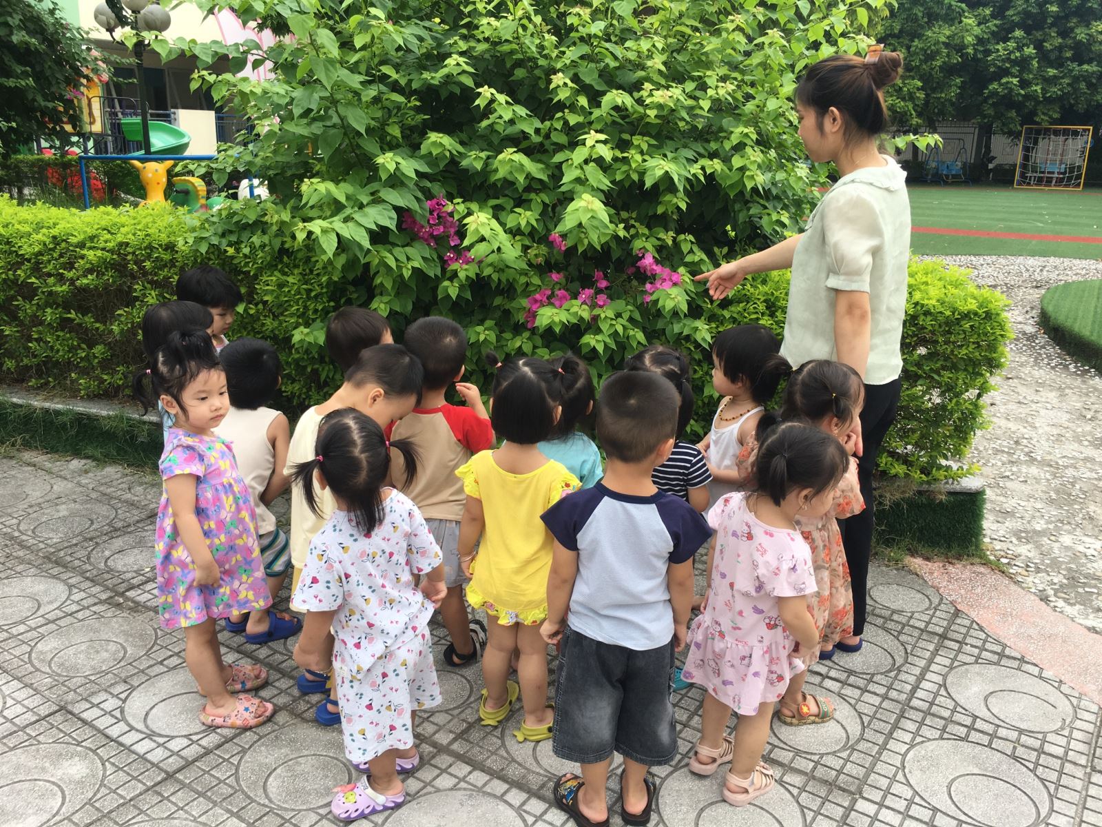 Cô Tuyết cho trẻ quan sát cây hoa giấy trong sân trường