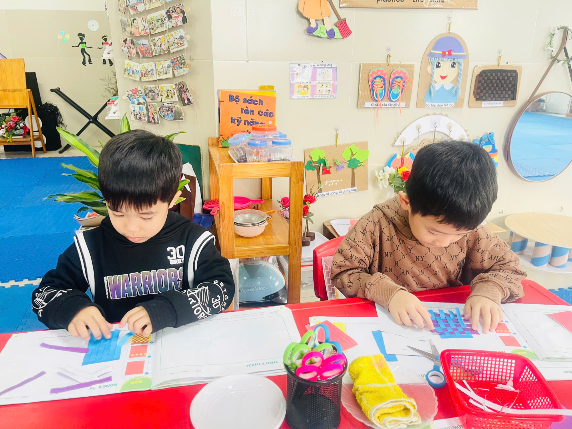 Rèn luyện kĩ năng vận động tinh thông qua các hoạt động nghệ thuật, hoạt động trải nghiệm giúp trẻ khéo léo hơn, tăng cường kỹ năng ghi nhớ có chủ đích, kỹ năng tập trung,... và đó cũng là những kỹ năng cần thiết để chuẩn bị tâm thế cho trẻ vào lớp 1.Vận động tinh là vận động đòi hỏi sự tỉ mỉ, sự điều khiển, phối hợp giữa các nhóm cơ nhỏ của bàn tay, ngón tay để thực hiện.Thông qua hoạt động này, trẻ được sử dụng đôi bàn tay khéo léo của mình để tạo ra các sản phẩm theo yêu cầu hoặc những sản phẩm mà mình yêu thích. Hoạt động thực hành đan nong mốt thực sự là một trải nghiệm tuyệt với đối với các bạn lớp mẫu giáo lớn A5. Qua hoạt động này các con biết được cách để đan được một tấm đan nong mốt là như thế nào. Đan nong mốt, một hoạt động đơn giản thôi nhưng đòi hỏi trẻ phải tập trung cao và sử dụng đôi bàn tay thật khéo léo. Từng ngón tay nhỏ xinh khéo léo của các bé nhấc từng nan, từng nan để đan, sắp xếp giữa các nan ngang và nan dọc. Hoạt động này còn giúp các con có kiến thức về sắp xếp xen kẽ, số chắn - số lẻ, về phối màu... Đan nong mốt cũng là một trong những bài thực hành của các bạn khi bước vào trường tiểu học. Chắc chắn bài học ngày hôm nay ở lớp mẫu giáo lớn sẽ giúp các bạn tự tin hơn khi vào lớp 1 đấy nhé! Dưới đây là một số hình ảnh của các bạn lớp Mẫu giáo lớn A5 trong giờ hoạt động tạo hình " Đan nong mốt":