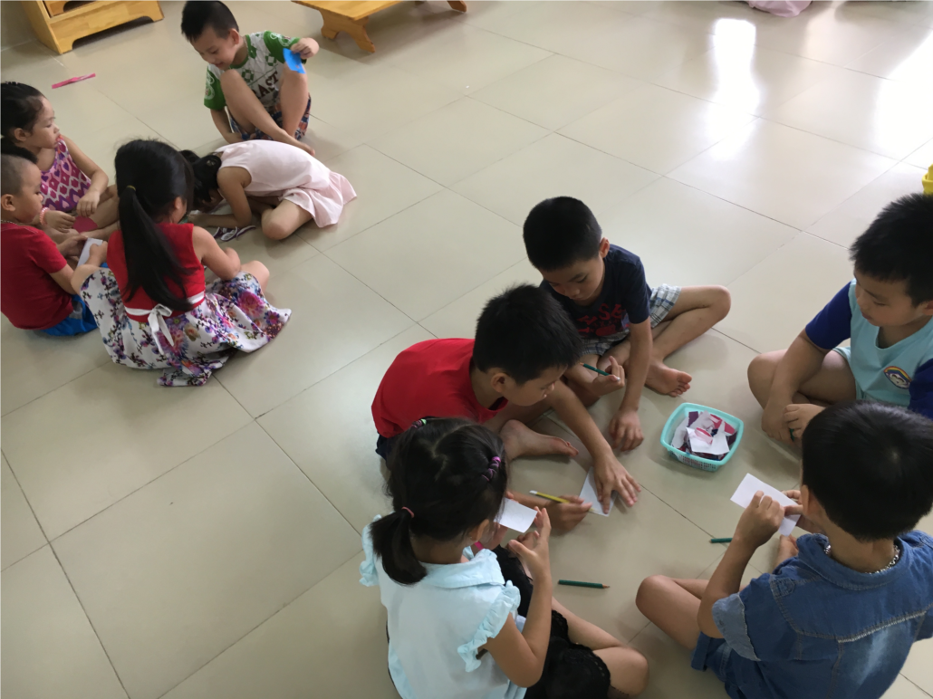 Các con đều tích cực, hăng say luyện tập kĩ năng bấm theo hình tròn và xé các dải dài. Kết quả, 100% trẻ đạt yêu cầu về kĩ năng xé dải, 80 % các con có kĩ năng xé bấm tốt.