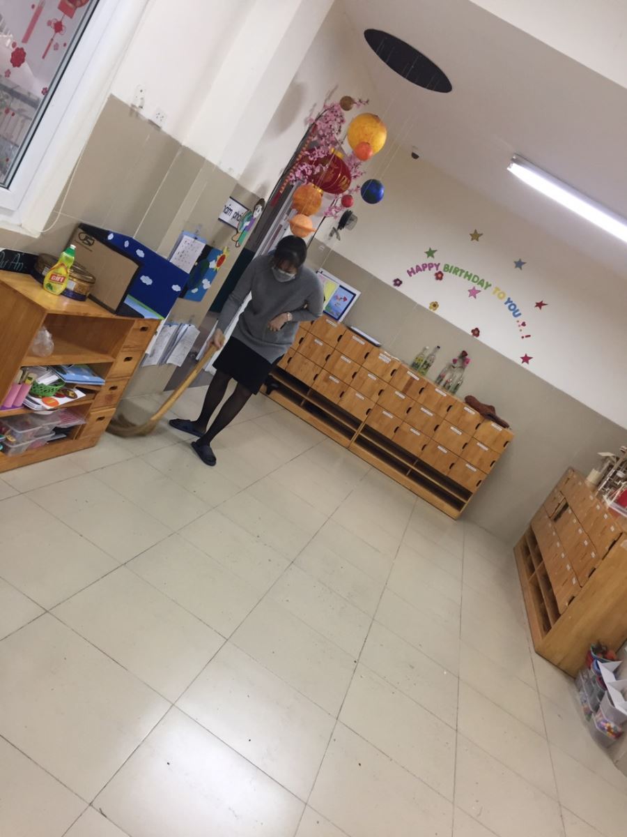 CBGVNV nhà trường đã thực hiện tổng vệ sinh, tẩy rửa sát trùng, khử khuẩn toàn bộ các khu vực trong và ngoài lớp học, các phòng chức năng, đồ dùng đồ chơi, bàn ghế, tay nắm cửa, lan cang cầu thang, hành lang… bằng dung dịch sát khuẩn Cloramin B. Đây là việc làm rất thiết thực trước tình hình dịch bệnh đang diễn ra hiện nay. Nhà trường luôn cố gắng đảm bảo phòng chống dịch viêm đường hô hấp cấp do chủng mới của virus Corona tốt nhất, để có một môi trường sạch sẽ đảm bảo an toàn chào đón trẻ quay lại