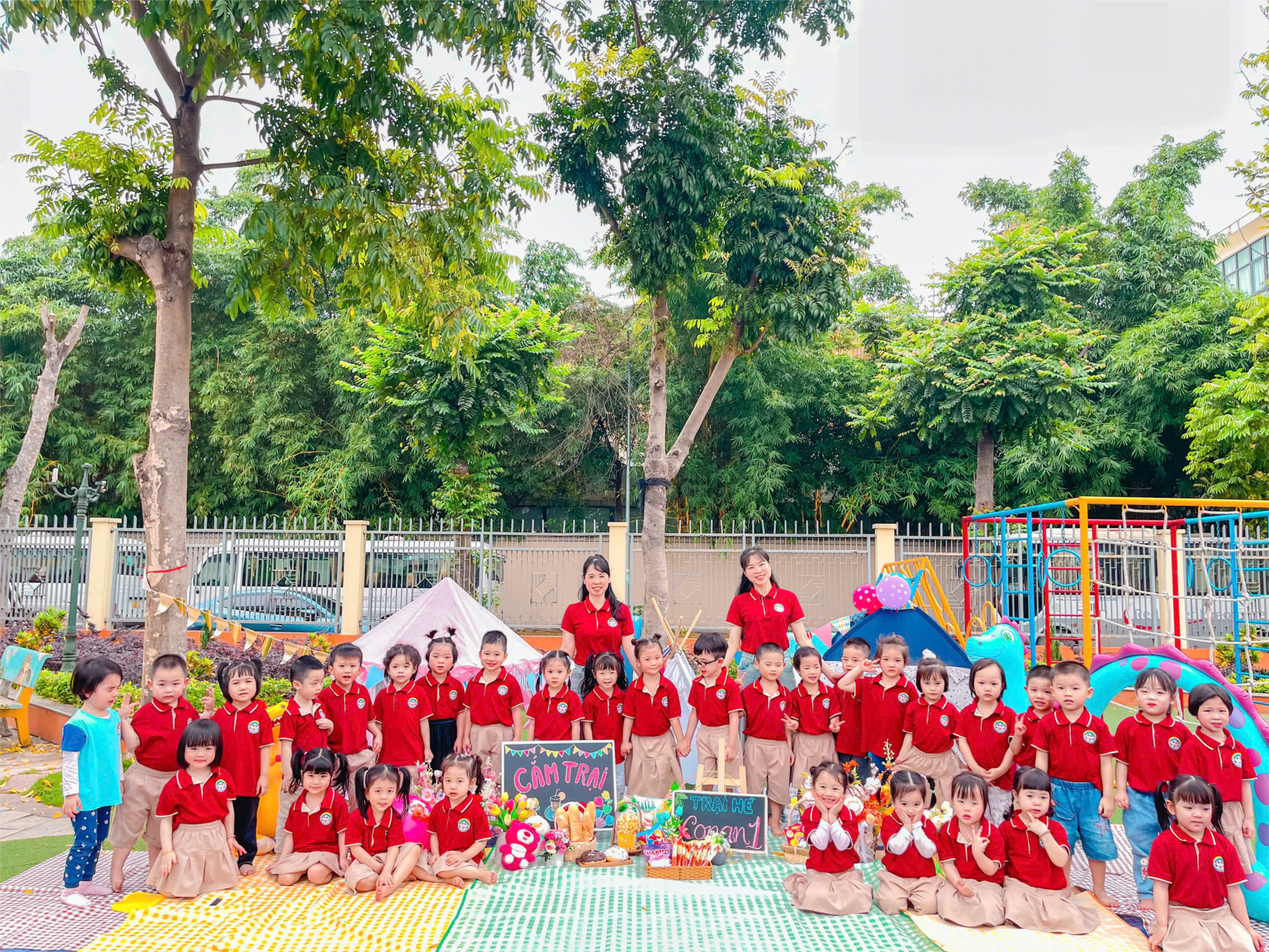 Vào một buổi sáng trời trong xanh, nắng nhẹ và mát mẻ, các bé lớp mẫu giáo bé C1 đã cùng nhau tham gia buổi cắm trại ngoài trời vô cùng thú vị. Ngay từ sáng sớm, bé nào cũng háo hức chuẩn bị ba lô, mang theo những món ăn nhẹ như bánh, kẹo, trái cây, sữa hộp... để cùng bạn bè chia sẻ. Không gian sân trường hôm ấy được trang trí rực rỡ với cờ, bóng bay, và những chiếc lều nhỏ xinh xắn được dựng lên dưới những tán cây mát rượi. Các bé ngồi quây quần bên nhau trên tấm bạt, cùng nhau trò chuyện, ăn bánh, uống sữa và kể cho nhau nghe những câu chuyện đáng yêu trong tiếng nhạc vui tươi vang lên rộn ràng.