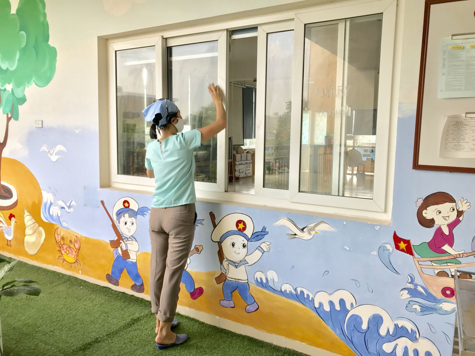 Cô lau cửa kính bằng dung dịch sát khuẩn Cloramin B