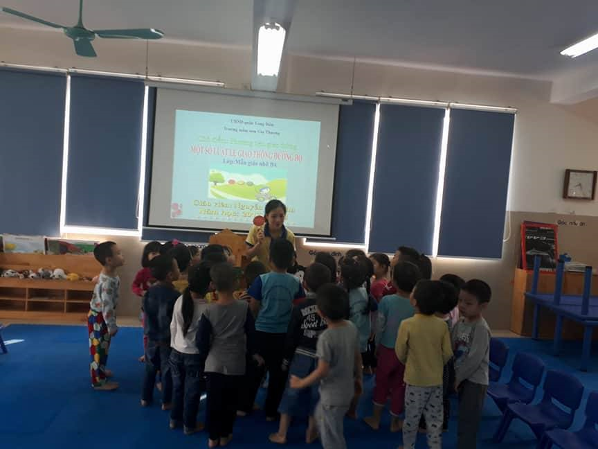 Cô đưa ra các câu hỏi, gợi ý về luật lệ giao thông để trẻ trả lời