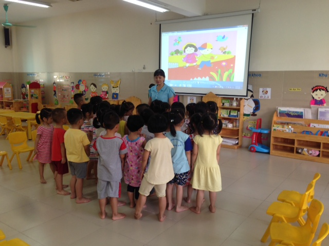 Cô giáo đã hướng dẫn các bé múa minh họa theo lời bài hát, các bé đã hào hứng múa cùng cô.