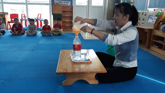 - B1: tay phải cô cầm cốc, tay trái cô giữ phễu. Cô múc vừa đầy cốc nước đổ vào chai và đặt 1 viên sỏi bên cạnh chai nước