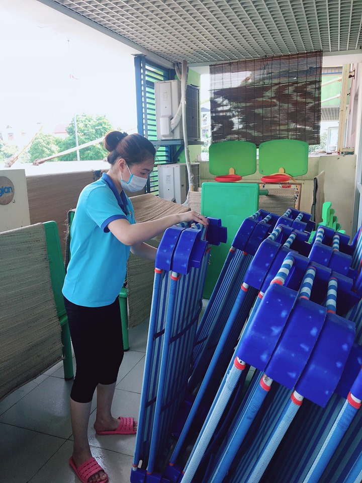 Ngay từ sáng sớm, giáo viên trong lớp đã tiến hành khử khuẩn lớp học theo đúng hướng dẫn của Bộ y tế và cơ quan chuyên môn, bao gồm các khu vực: trong lớp, hiên trước, hiên sau, các vật dụng thường xuyên cầm, nắm: cửa lớp, tay vịn cầu thang, bàn ghế, đồ chơi, dụng cụ học tập,vệ sinh phòng học bằng Cloramin B và nước tẩy rửa thông thường. Thực hiện giặt chăn, chiếu, gối, vệ sinh cốc uống nước, khăn mặt cá nhân của trẻ…