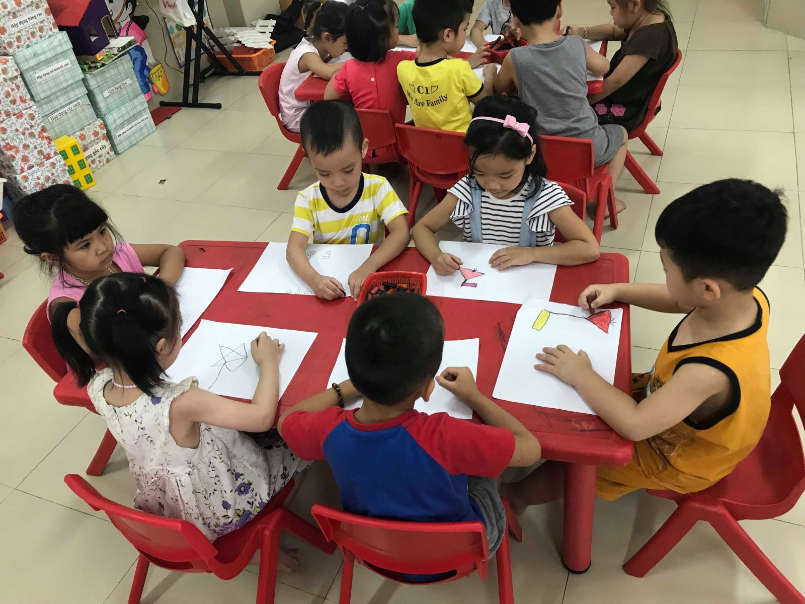 Các bé cầm bút ngồi học