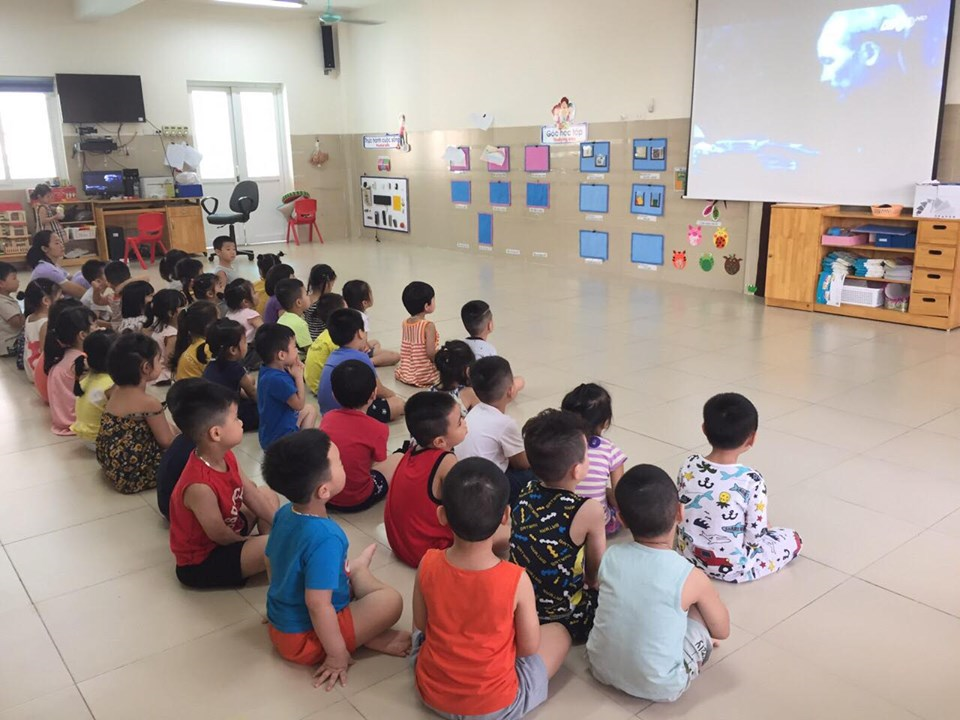 Các bạn đang chăm chú xem 1 đoạn video nói về bác Hồ và các bạn nhỏ.