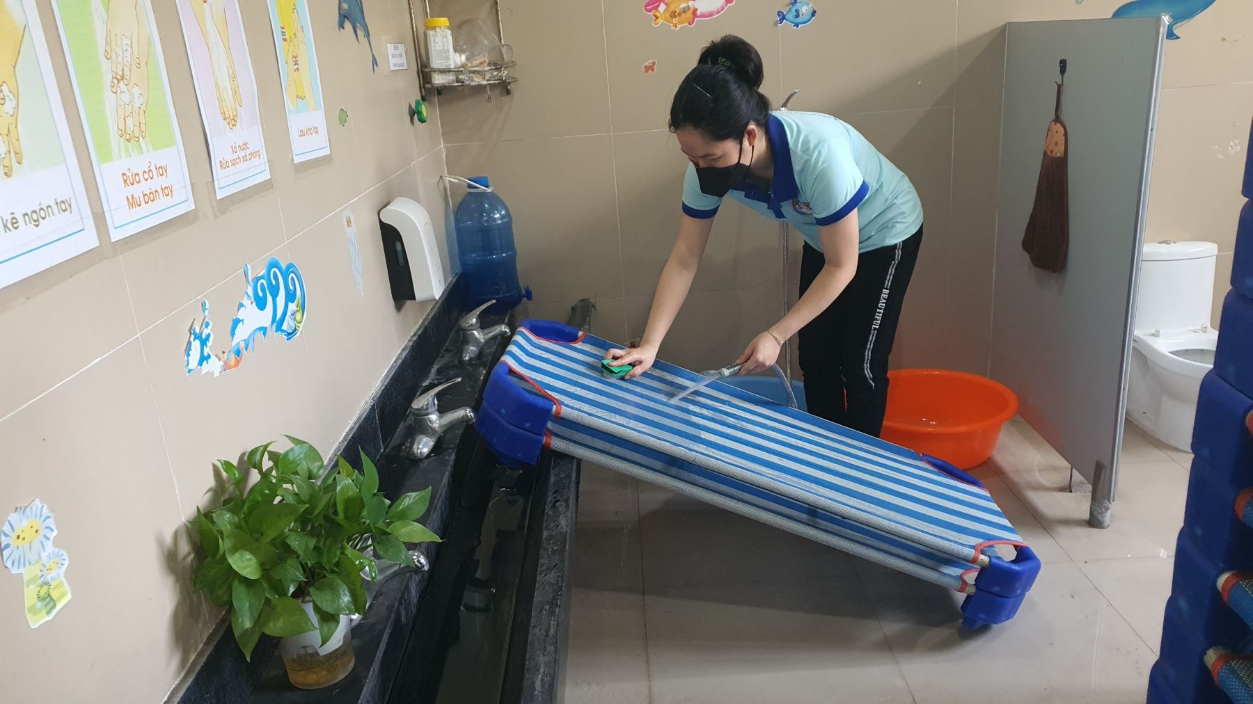 Cô Hải rửa đồ chơi sạch sẽ