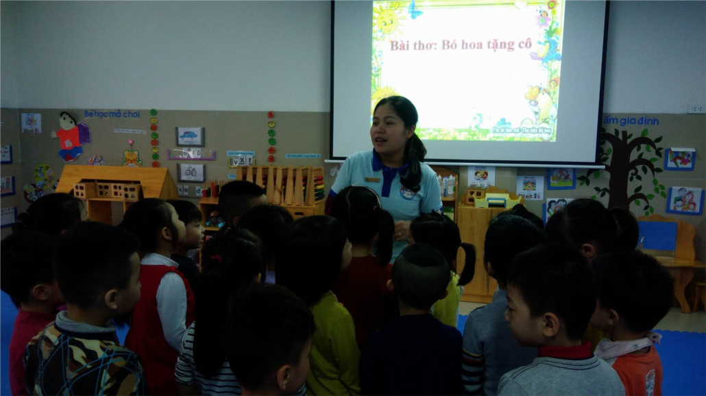 Chúng tớ cùng lắng nghe cô đọc bài thơ.