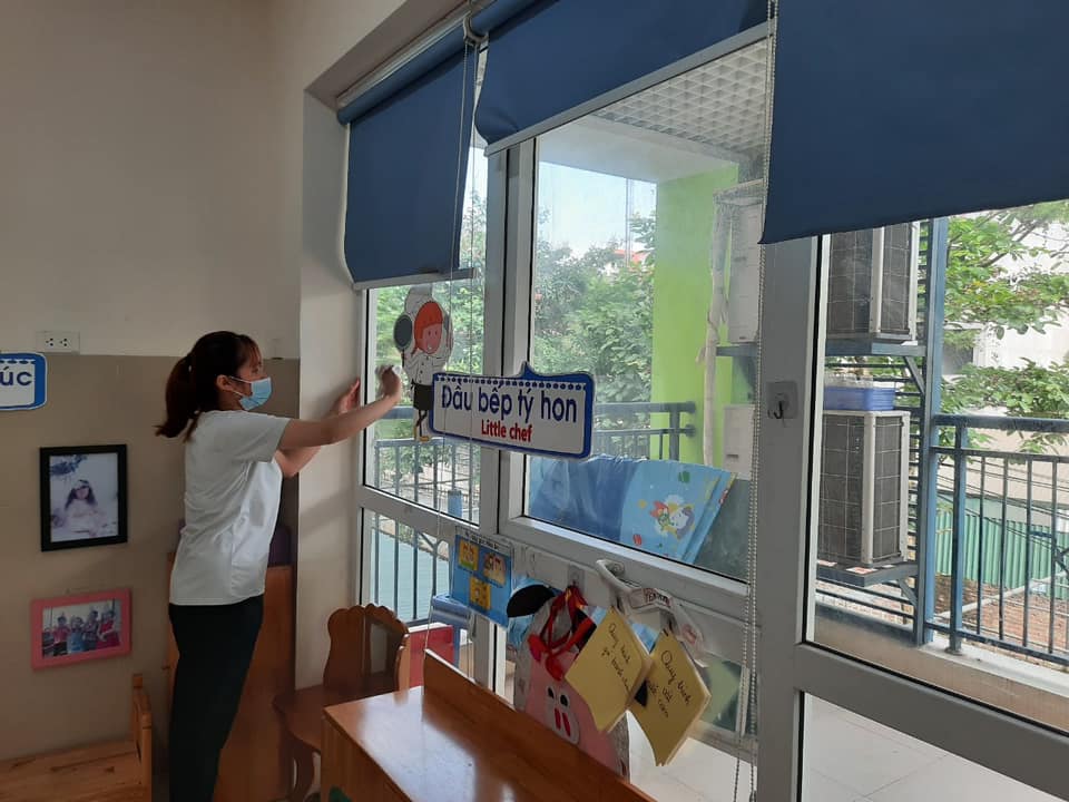 Với vai trò của giáo viên mầm non, là việc chăm sóc giáo dục trẻ em trong độ tuổi nhỏ nhất, của cấp học đầu đời, từ độ tuổi nhà trẻ cho đến lứa tuổi mẫu giáo, độ tuổi này đến trường hoàn toàn chưa có ý thức về sự ảnh hưởng phòng tránh dịch bệnh, và để có những hành động bảo vệ sức khỏe cho bản thân, một lứa tuổi đang dần hình thành và tập thói quen để chuẩn bị cho việc đi học chính thức. Từ khi học sinh nghỉ học đến nay, nhà trường đã phân công thực hiện dọn dẹp vệ sinh trường lớp . Trong đó, thực hiện quét dọn, thu gom rác sân trường, dùng nước khử khuẩn lau chùi tay vịn cầu thang, tay nắm cửa, bàn, ghế, phòng học, các phòng chức năng và các đồ dùng dạy học. Để đảm bảo vệ sinh phòng chống dịch, đảm bảo mỗi trẻ 1 cốc nước riêng , trang bị xà phòng, nước rửa tay khô ở mỗi lớp cho các cán bộ, giáo viên, học sinh khi đến trường. Tại phòng y tế, nhà trường cũng đã trang bị sẵn khẩu trang dự phòng, máy đo thân nhiệt, cồn sát khuẩn. Đồng thời, nhà trường tiếp tục đẩy mạnh công tác tuyên truyền trực tiếp tại trường và qua tin nhắn tới phụ huynh và học sinh về công tác phòng, chống dịch Covid-19. Sau đây là một số hình ảnh của các cô vệ sinh tại lớp học :