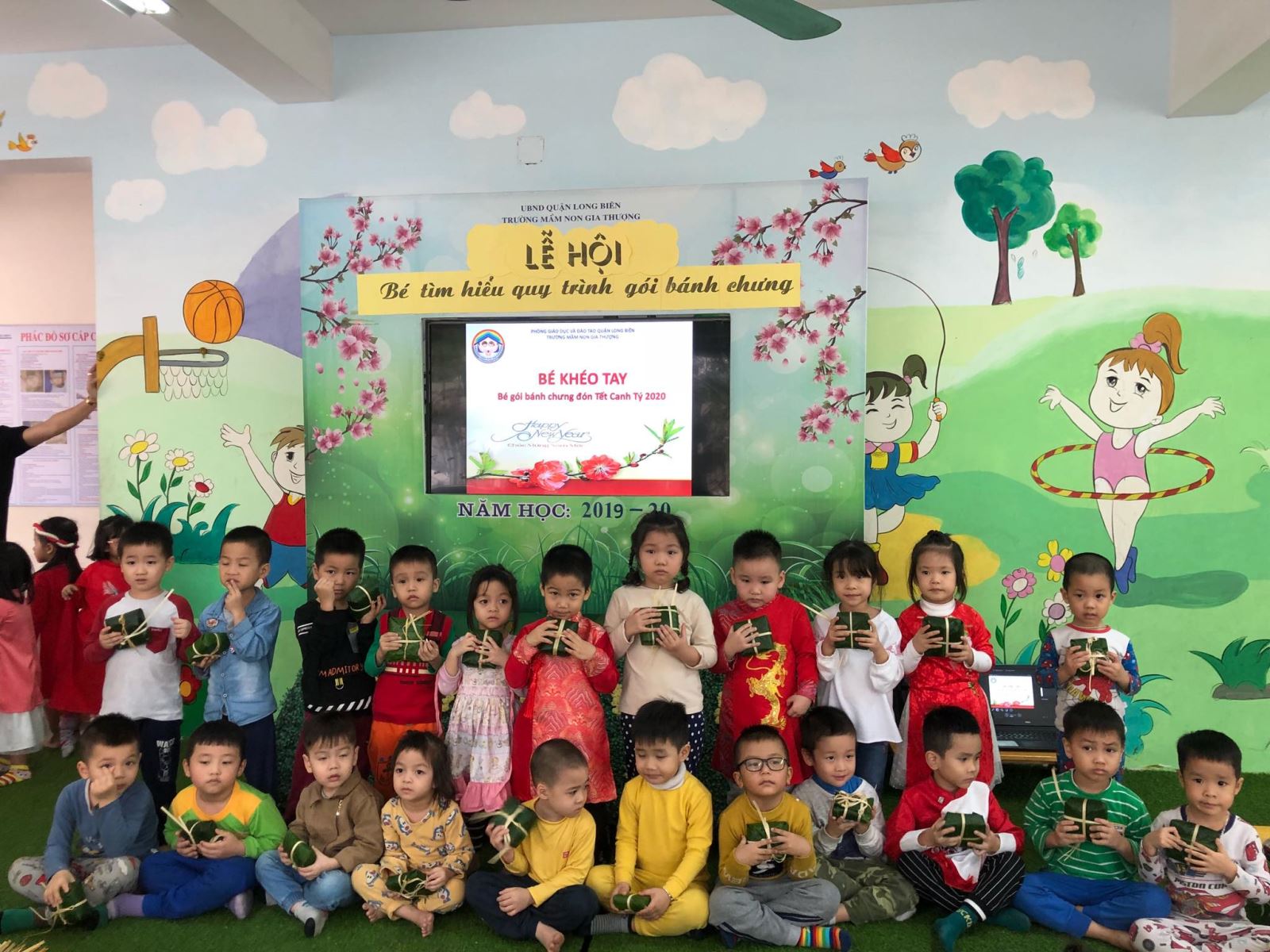Chà !important;o mừng xuân Canh Tý 2020, trường Mầm non Gia Thượng tổ chức Ngày hội "Bé tập gói bánh chưng" với mong muốn mang đến cho các học sinh của mình không khí của ngày Tết cổ truyền qua “Sự tích bánh chưng, bánh dày” và trải nghiệm gói bánh chưng. Các con rất vui và háo hức khi được tham gia ngày hội, có những trải nghiệm thật vui và thú vị, được tự tay làm ra những chiếc bánh chưng với các nguyên liệu như: lá dong, gạo nếp, đỗ xanh, thịt..