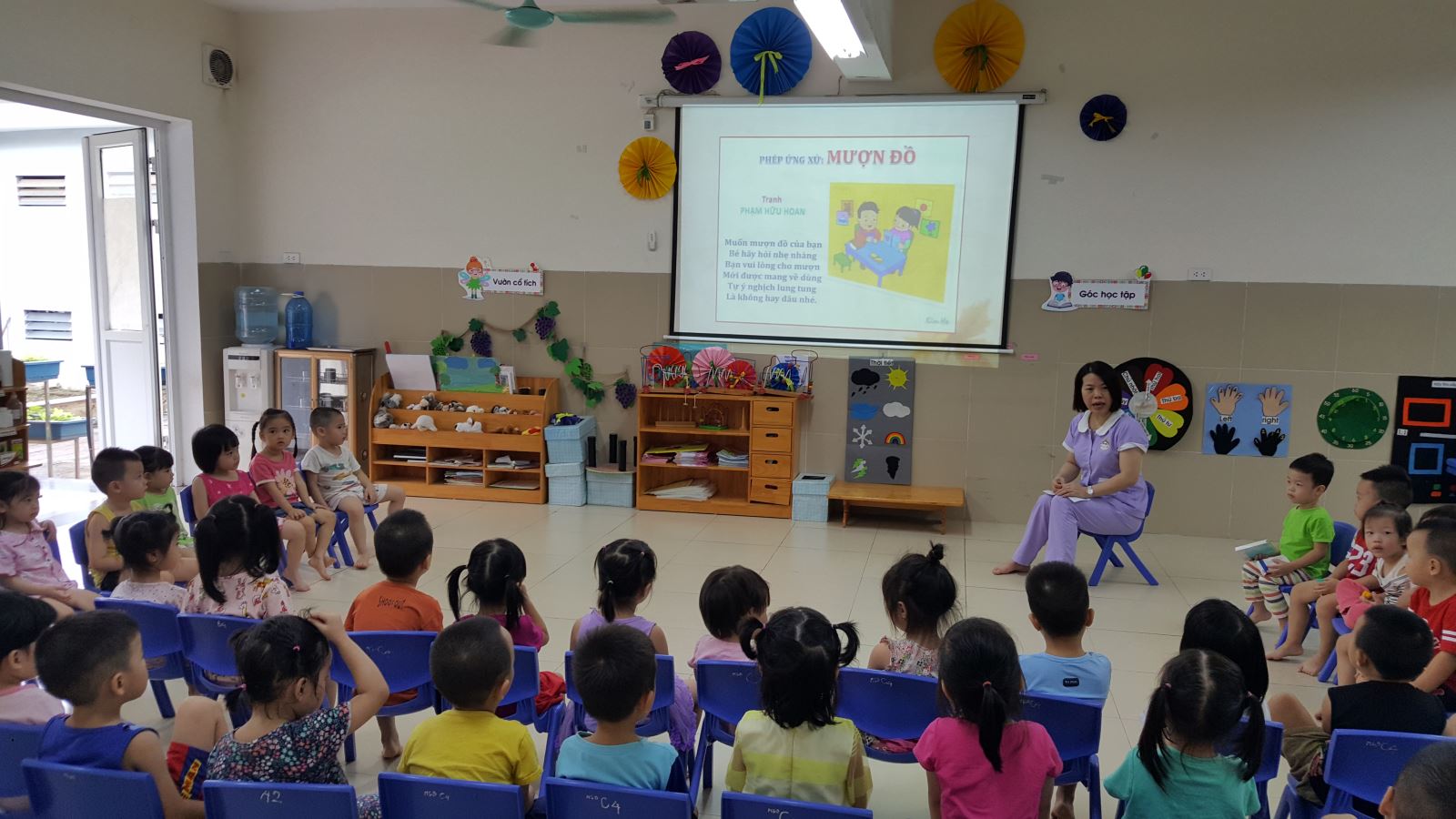 Cô giáo đọc mẫu bài thơ cho các bé nghe