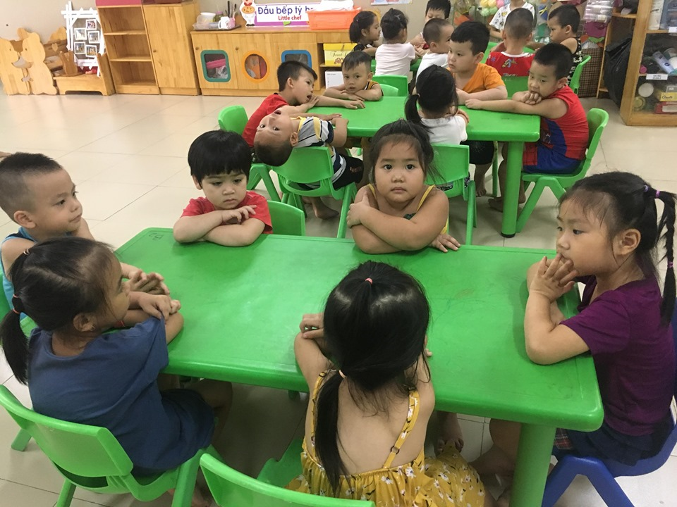 Trẻ ngồi ngắn theo tổ để cô điểm danh chuẩn bị vào giờ học
