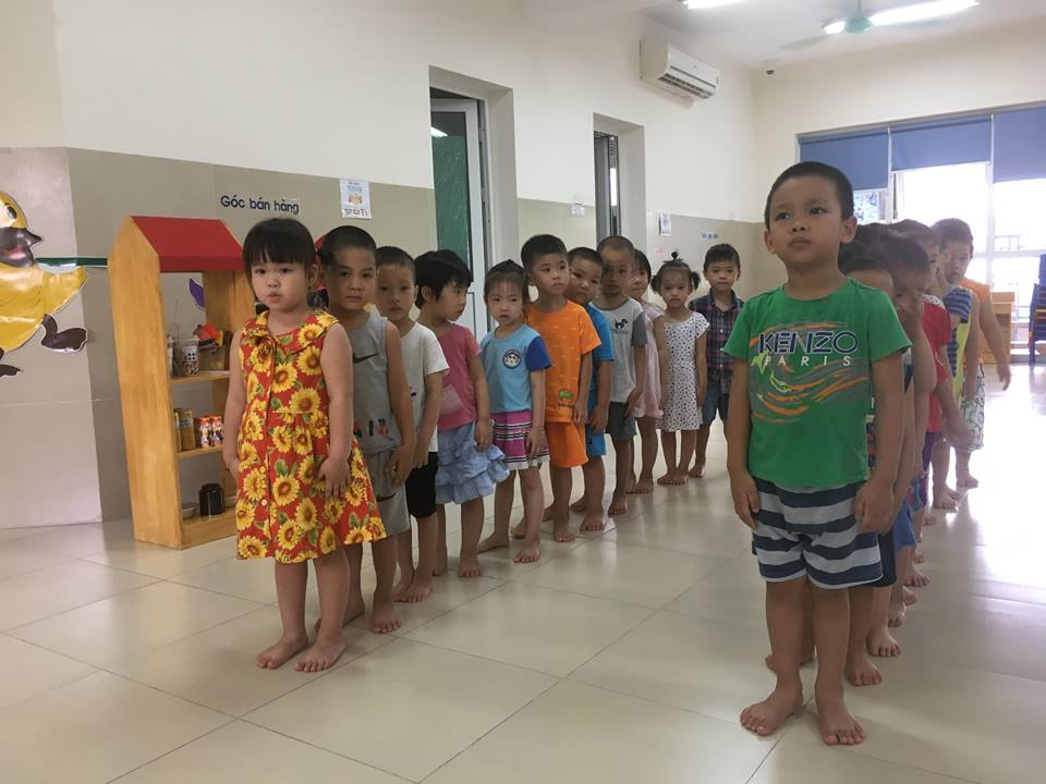 Cô giáo chúng tớ dặn khi đi vệ sinh hay rửa tay đều phải xếp hàng