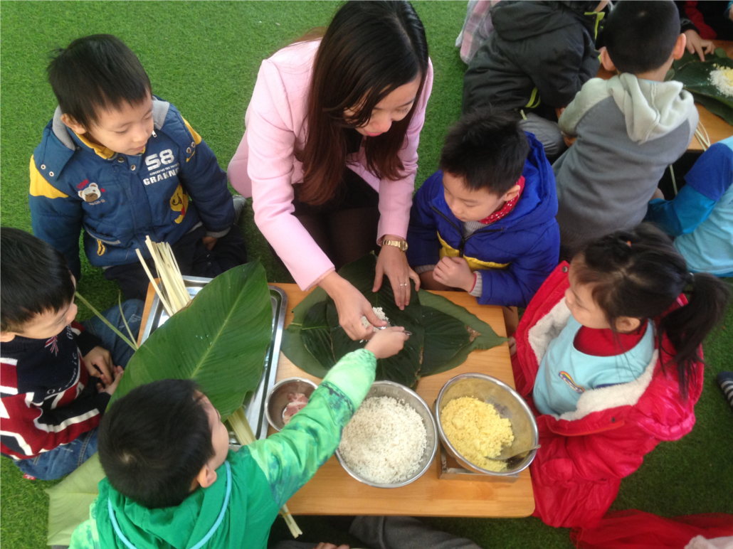 Cô Vũ Hương Trà cùng tham gia và giúp các bé thực hành quy trình gói bánh chưng.