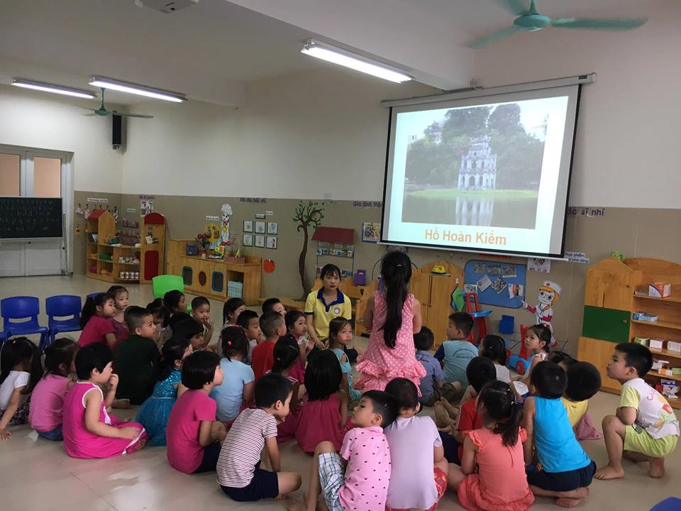 Mở đầu bài học, cô và trò lớp A2 cùng trò chuyện về một số danh lam thắng cảnh ở Hà Nội