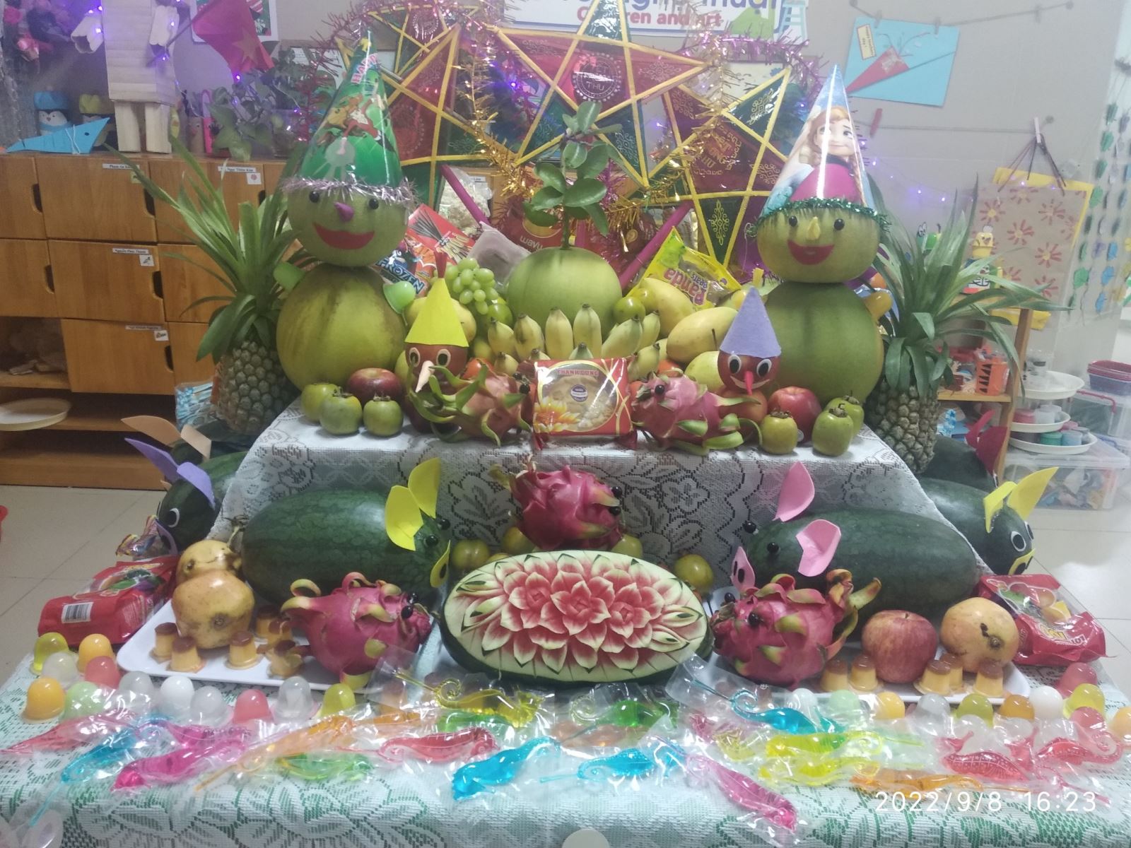 Cô giáo Phạm Thị Thảnh, Phạm Thị Thu Hải cùng các bé B1 đã bày được mâm cỗ trung thu rất đẹp