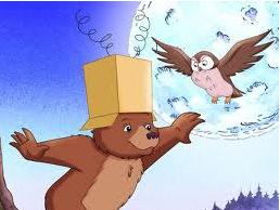 Gấu con tung tăng chạy nhảy và mải lắng nghe chim Sơn Ca hót nên va phải bạn Sóc khiến giỏ nấm văng tung toé ra đất. Gấu con vội vàng khoanh tay và lễ phép nói: