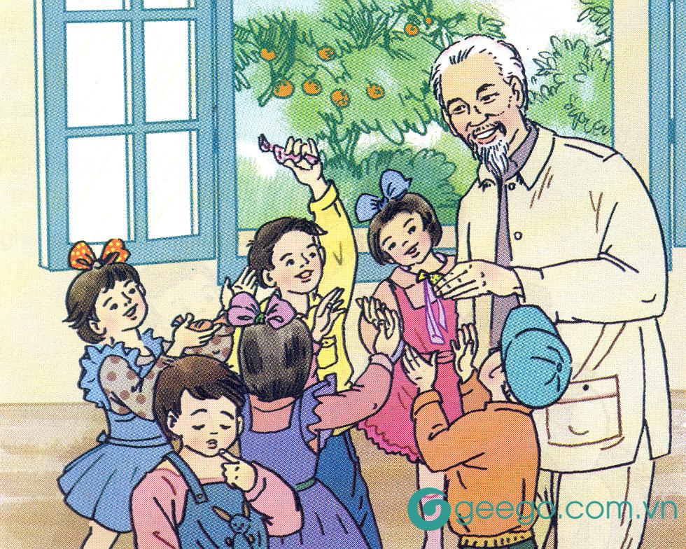 Bác khen các cháu ngoan và chia kẹo cho từng em một. Mọi người đứng thành một vũng trũn. Một em đứng lên thưa: