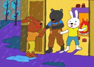 – Hu, hu, hu,nhà bị đổ mất rồi. Làm thế nào bây giờ ! Gấu Đen kéo Thỏ Nâu đến bên đống lửa an ủi Thỏ Nâu: