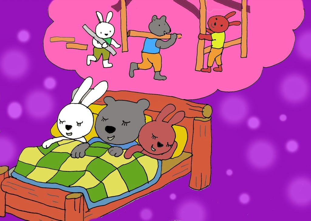Đêm hôm ấy, Thỏ Nâu và Thỏ Trắng ôm bác Gấu Đen ngủ ngon lành.