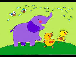 Bỗng một chú voi con xuất hiện, chú dùng vòi khều con sâu đưa cho vịt con. Vịt và gà con cùng cảm ơn chú voi. Vịt và gà con lại rủ nhau ra ao chơi . Chân vịt con có màng nên vịt bơi lội rất giỏi, còn gà con vô ý nên bị ngã xuống ao, vì không biết bơi nên gà con bị ướt sũng nước, lạnh đến phát run. May quá, chú voi lại đi tới. Chú cứu gà con lên, chú còn đùa nghịch dùng vòi phun đầy nước vào gà con và vịt con. Gà và vịt cười vang bỏ chạy, còn lũ ruồi đậu trên lưng chú voi cũng phải hốt hoảng bay đi. Sau đó voi dùng kèn thổi acmônica. Chú thổi hay đến nổi gà con và vịt non đang chơi vui cũng phải chạy đến, những chú chim trên cành cây cũng ngừng hót để lắng nghe những âm thanh tuyệt vời mà voi thổi.