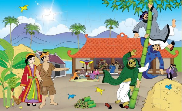 Nó bèn bó cả lại mà gánh về nhà. Đến nơi thấy hai họ đang ăn uống vui vẻ, sắp đến lúc rước dâu, nó mới hay là ông chủ đã lừa nó đem gả con gái cho người ta rồi. Nó không nói gì, đợi lúc nhà trai đốt pháo cưới, bèn đem một trăm khúc tre xếp dài dưới đất, rồi lẩm bẩm đọc: “Khắc nhập, khắc nhập” cho liền lại thành một cây tre trăm đốt, đoạn gọi ông chủ đến bảo là đã tìm ra được, và đòi gả con gái cho nó. Ông chủ lấy làm lạ cầm cây tre lên xem, nó đọc luôn: “Khắc nhập, khắc nhập”, thì ông ta bị dính liền ngay vào cây tre, không làm sao gỡ ra được. Ông thông gia thấy vậy chạy đến, định gỡ cho, nó lại đọc luôn: “Khắc nhập, khắc nhập”, thì cả ông cũng bị dính theo luôn, không lôi ra được nữa.