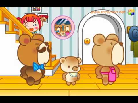 Cô chạy vào một ngôi nhà nhỏ và nhình thấy ba cái bàn và ba cái bát, một cái nhỏ, một cái vừa và một cái to. Cô ngồi xuống và ăn thức ăn để trong ba cái bát và tự nhủ: “ Ngon tuyệt!”. Cô nhìn xung quanh và nhìn thấy ba cái giường, một cái nhỏ, một cái vừa và một cái to. Cô reo lên sung sướng: “Ôi! Những cái giường mới ấm áp làm sao!”. Cô chọn cái giường lớn nhất để ngủ.