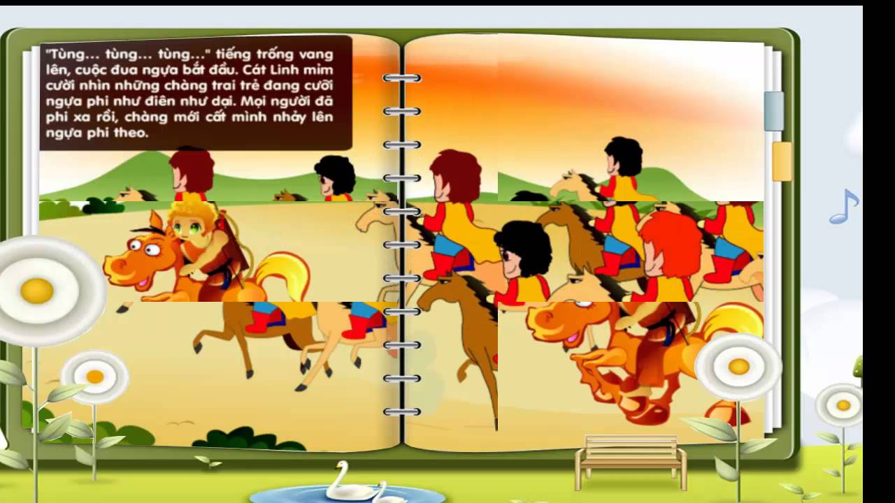 "Tùng... tùng... tùng..." tiếng trống vang lên, cuộc đua ngựa bắt đầu. Cát Linh mỉm cười nhìn những chàng trai trẻ đang cưỡi ngựa phi như điên như dại.Mọi người đã phi xa rồi, chàng mới cất mình nhảy lên ngựa phi theo. Chỉ một lát, những con ngựa khác đã rớt lại phía sau, chàng tới đích giữa những tiếng hô reo nồng nhiệt của mọi người. Tiếp đó là cuộc thi ngựa bắn cung. Điều này làm cho Cát Linh có chút ít lo lắng vì vừa phi ngựa vừa bắn cung không phải là chuyện dễ, hơn nữa, chàng chưa hề luyện tập qua. Nhưng Cát Linh không hề nao núng, chờ mọi người bắn xong chàng mới bước ra cúi chào quốc vương, rồi lên ngựa phi thẳng về phía trước một đoạn đường, chàng quay lại nhìn đúng bia để bắn liền chín phát. Chín mũi tên đều xuyên qua hồng tâm. Quốc vương trong lòng rất kinh ngạc. Mọi người reo lên khen ngợi. Những người dự thi bắn cung đều đứng ngây ra như tượng gỗ, há hốc miệng không nói nên lời.