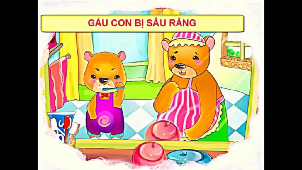 Nhớ lời bác sĩ dặn, ngày nào Gấu con cũng chăm chỉ đánh răng. Chú đánh ăng r ất cẩn thận, đánh mặt tr ước, mặt sau của răng theo đúng lời dặn của bác sĩ làm cho răng trắng bóng. Gấu con không ăn nhiều bánh kẹo mà ăn nhiều các chất bổ khác như thịt, cá, trứng, sữa, rau quả tươi, nên răng của chú trở nên chắc và khỏe hơn.
