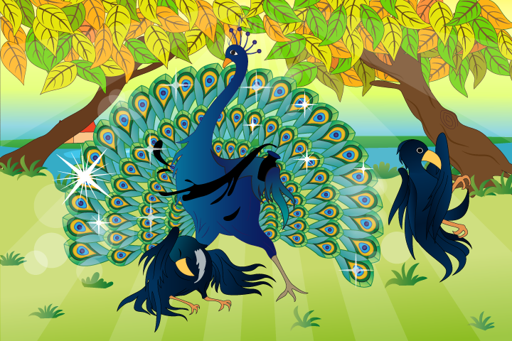 Quạ bèn tô điểm, vẽ vời cho Công trước. Quả nhiên cái mình, cái đuôi Công lóng lánh, có bao nhiêu màu sắc đẹp, đẹp hơn những giống chim khác nhiều