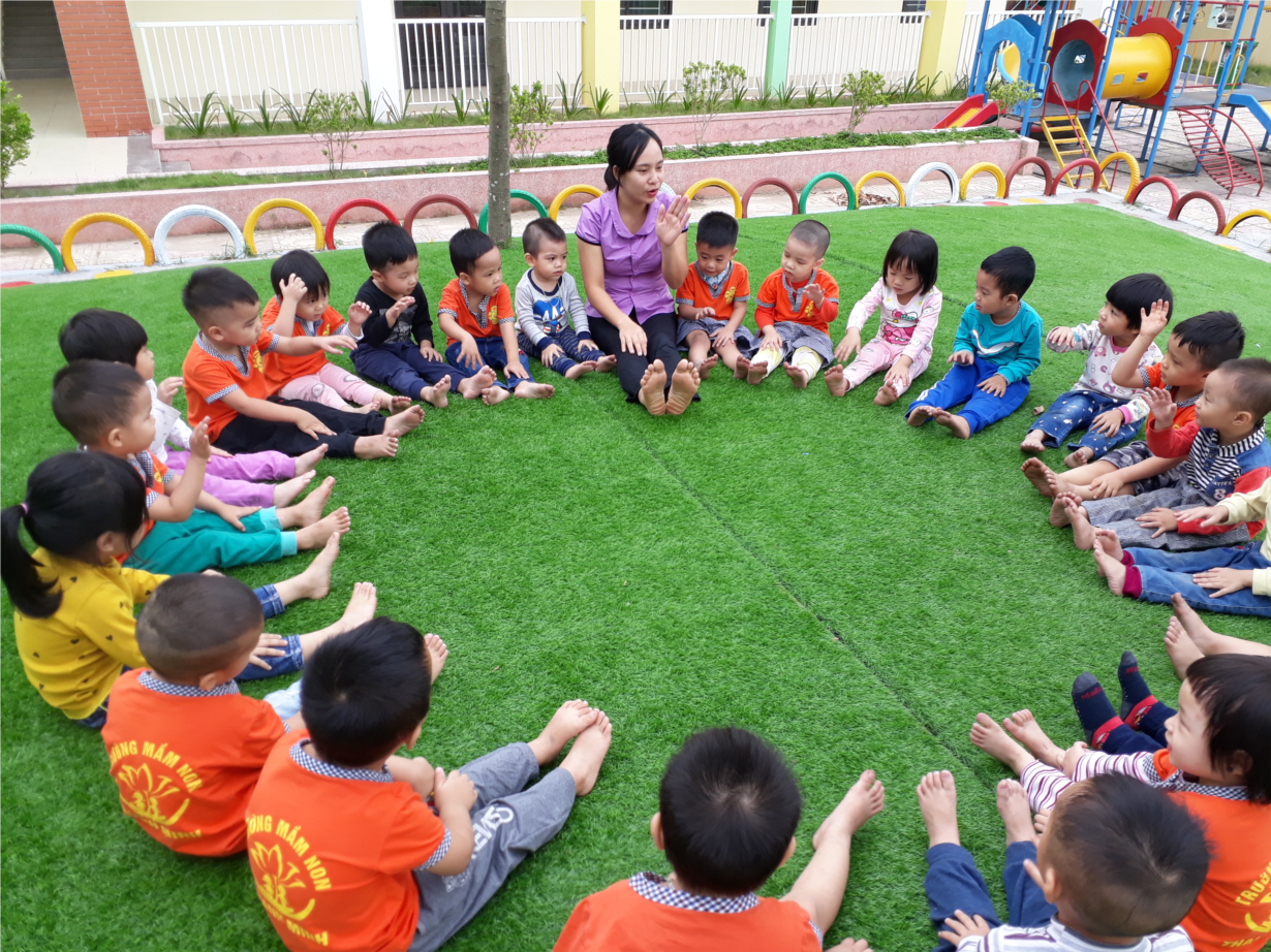 5 -6 trẻ ngồi duỗi thẳng chân, cô cho trẻ đếm bàn chân, ngón chân của mình, cả bạn. Cô giáo hỏi trẻ phía bên phải (trái) của trẻ có bao nhiêu chân, trẻ ngồi cạnh bạn nào, bạn ngồi giữa những bạn nào…Sau đó cô giáo vừa hát “Nu na nu nống” vừa vỗ vào chân từng trẻ. Từ “trống” cuối cùng kết thúc ở chân nào thì chân đó co lại. Cứ tiếp tục như thế cho đến khi tất cả các chân đều co hết. Những lần chơi sao, cô để trẻ tự chơi với nhau.